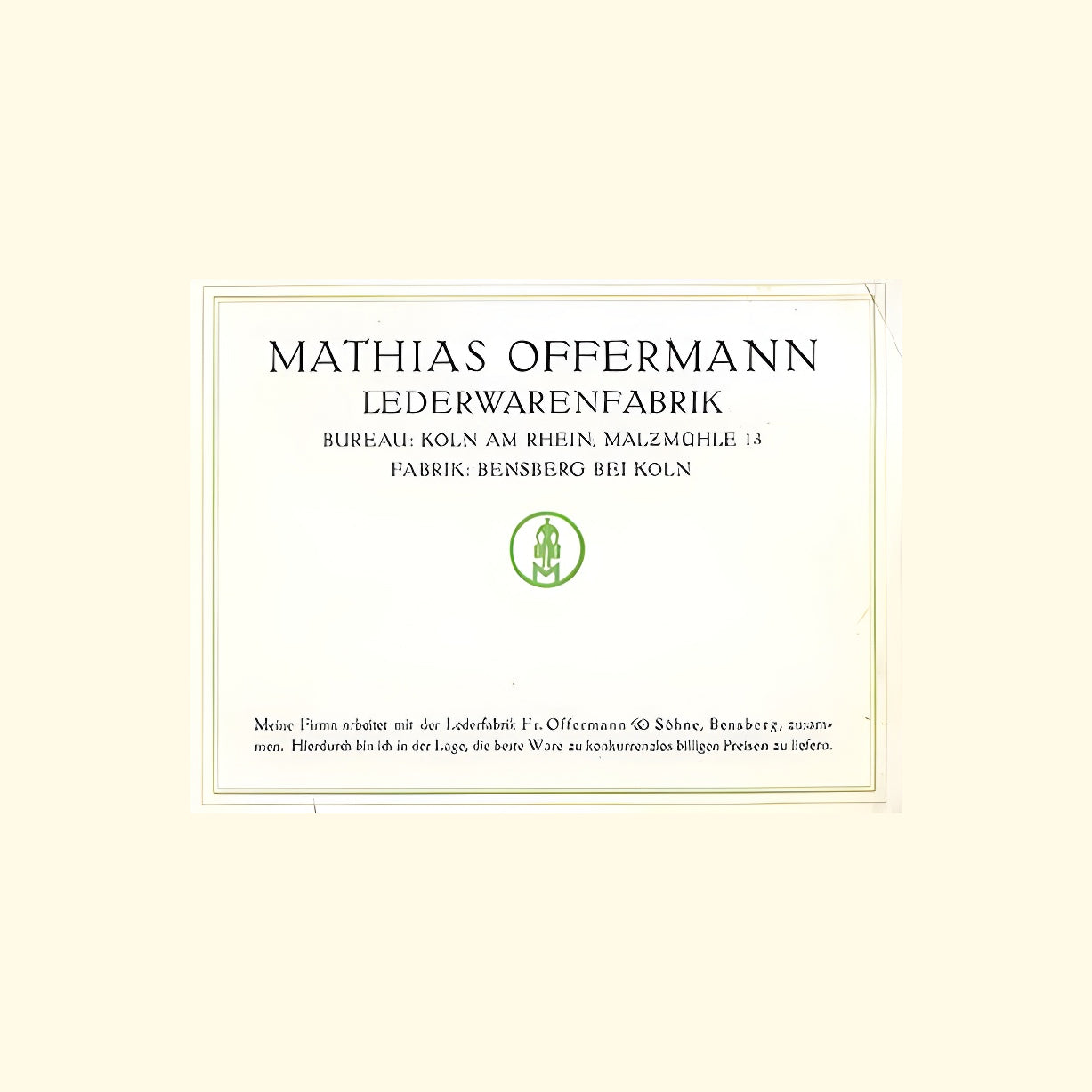 Im Jahr 1922 erweiterte sich unser Horizont, als Mathias Offermann mit der Verarbeitung von Leder als Sattler begann. In einer kleinen Werkstatt in Köln entstanden die ersten Offermann Lederwaren, die sich durch ihre herausragende Qualität und ihr zeitloses Design auszeichneten. Die hier hergestellten Taschen wurden in einem angrenzenden Laden verkauft, der auch die Keimzelle für die späteren, von Wilhelm Offermann gegründeten Geschäfte bildete. Dies markierte den Beginn unseres Engagements, nicht nur Leder zu perfektionieren, sondern auch Produkte zu schaffen, die das Leben der Menschen bereichern.